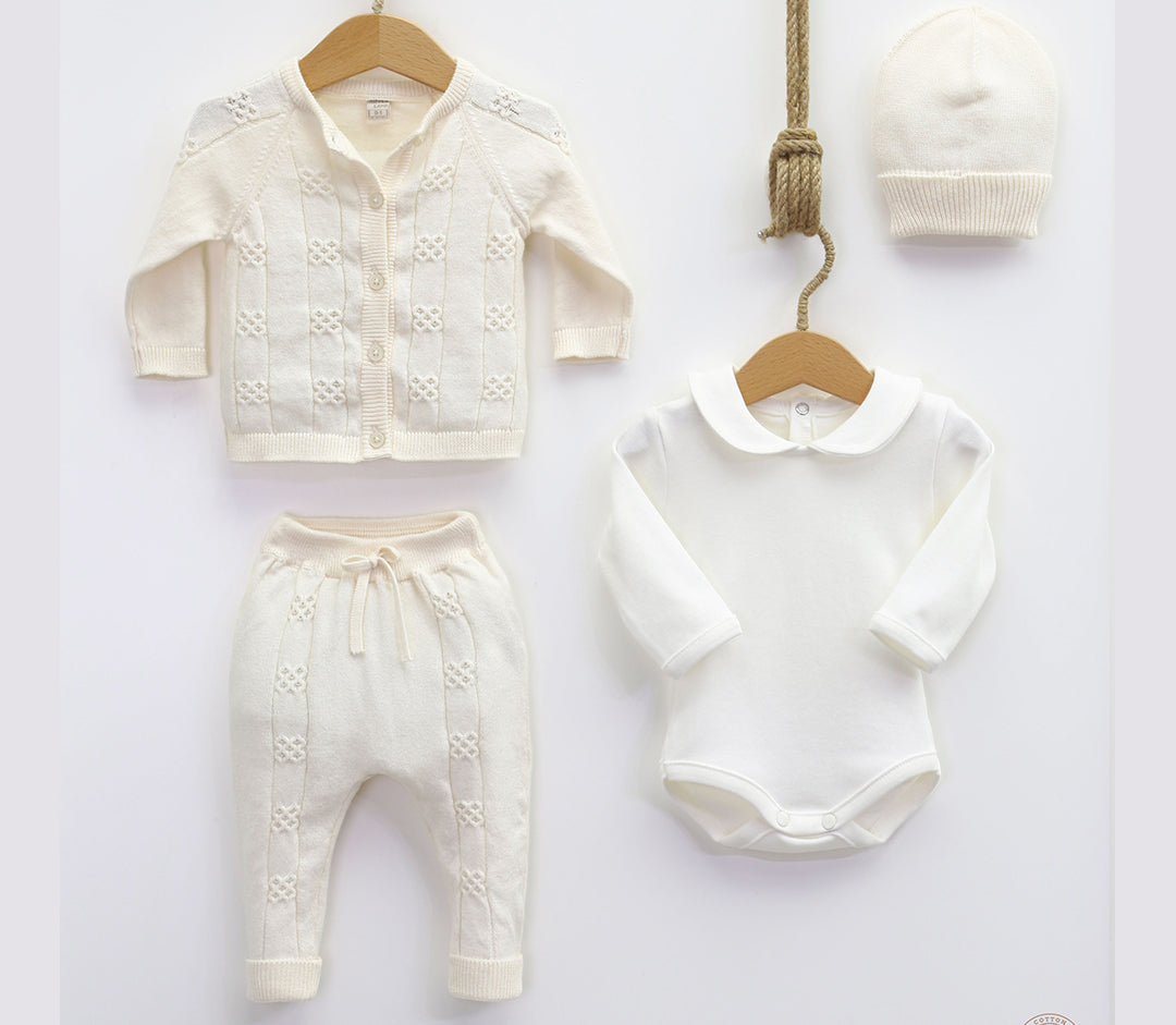 This 4-piece set consists of a cardigan, knitted trousers, a long-sleeved bodysuit with collar and a hat. The jacket and trousers have the same knitting pattern and are in the same color. The long-sleeved bodysuit is white and has a nice round collar. A knitted hat in the same color as the jacket and trousers complete the set. This set is available in five colors and different sizes.