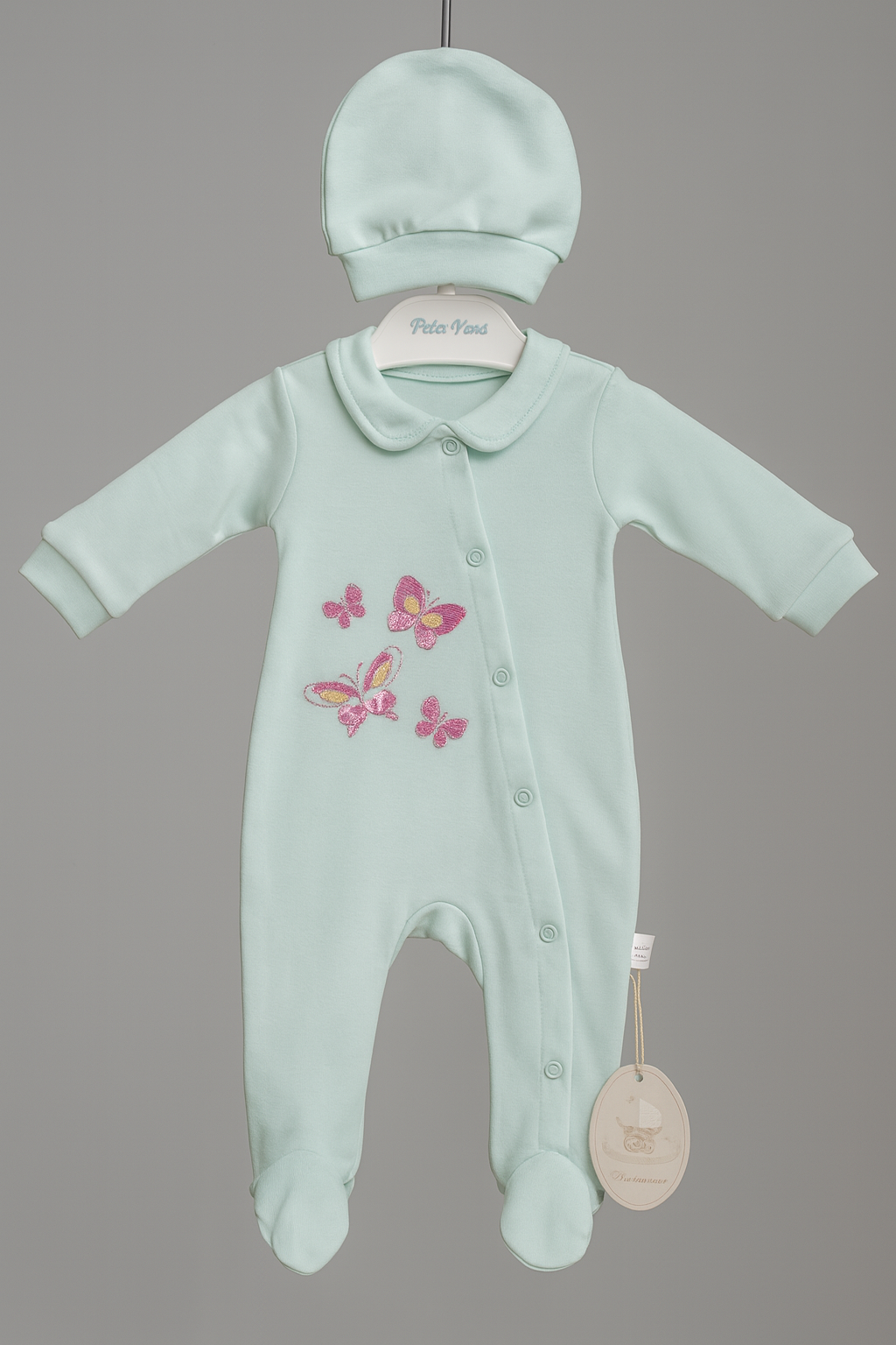 Dieser süße Strampler mit das Schmetterling Motto ist ein schönes Stück für Mädchen. Er ist vorne seitlich geknöpft und daher einfach an- und auszuziehen. Ein süßes Motiv von einem Schmetterling ziert die Brust. Dieser Strampler ist in ein grün erhältlich. Der Stoff besteht aus reiner Baumwolle und ist daher sehr zart zur Haut Ihres Babys.