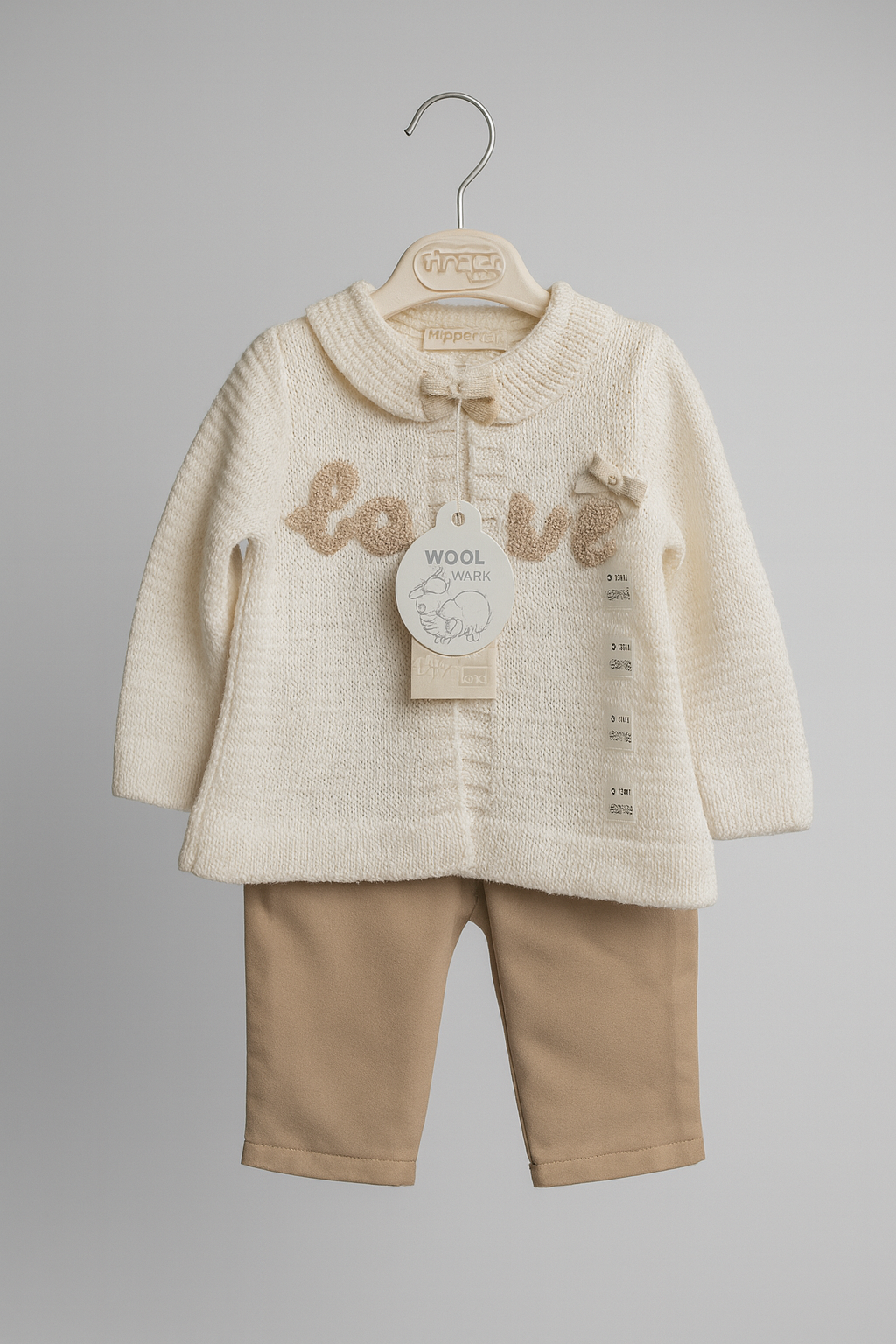 Dieses liebevolle Set besteht aus einer beigefarbenen Strickjacke und einer braunen Hose. Die Strickjacke hat einen liebevollen Aufdruck auf der Brust. Die Hose passt im Farbton perfekt zur Jacke. Dieses Komfortable und zugleich schicke Set sind ein Muss für Ihr Baby. Höchste Qualität und bester Tragekomfort sind auch bei diesem Set sicher. Dieses Set steht in verschiedenen Größen zur Auswahl.