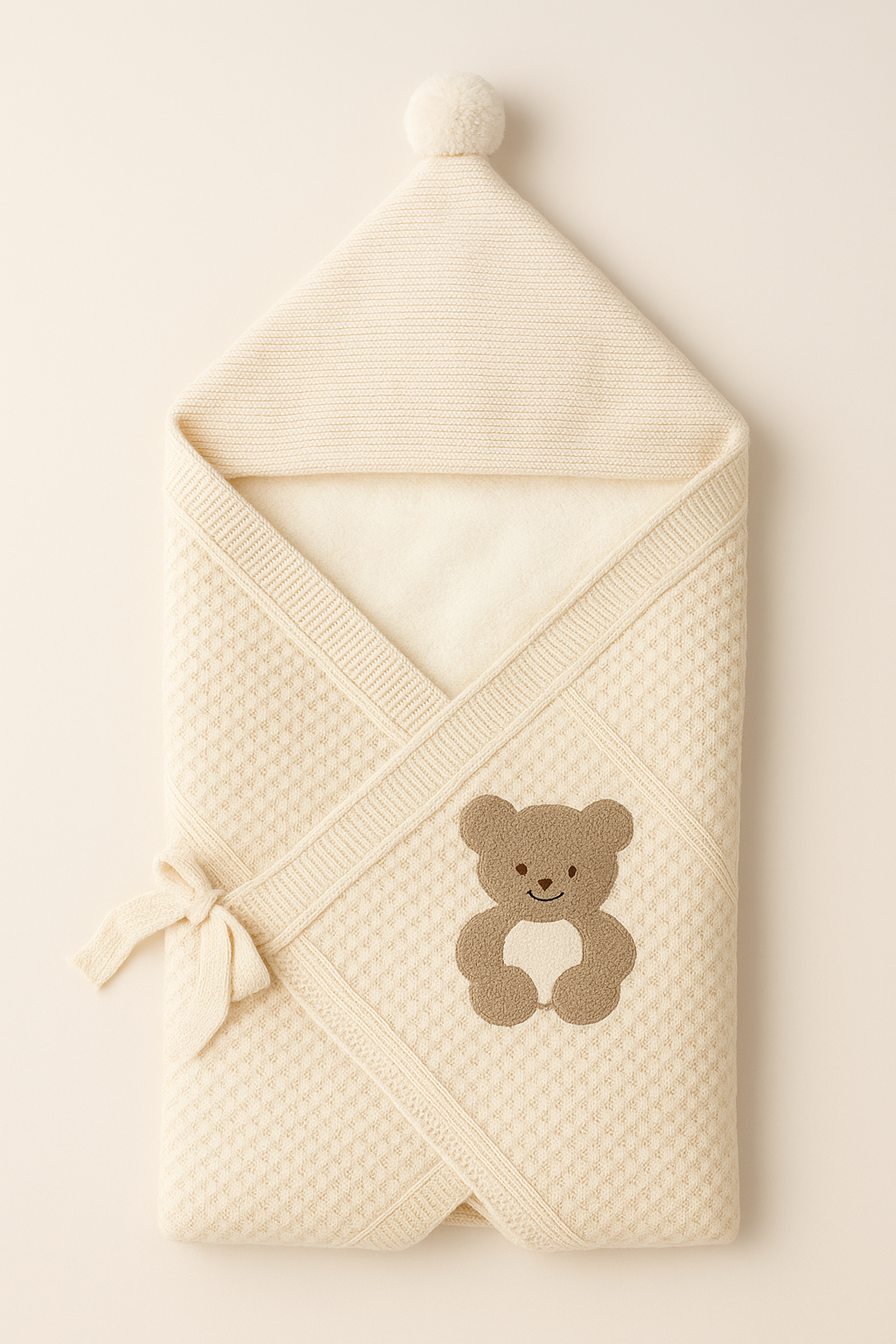 Diese Einschlagdecke ist ein Muss für jedes Baby. In der Größe 85 x 85cm ist sie genau passen für Babys. Sie ist aus feinem Strick hergestellt und verfügt innen über ein Plüschfutter was sie kuschelig warm macht.