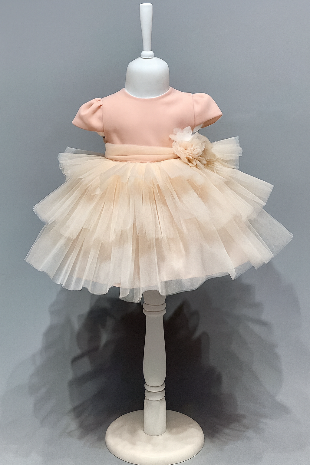 Ein besonders festliches Kleid für besondere Anlässe. Dieses wunderschöne Kleid aus Baumwolle wird von einem Tüllkleid ummantelt und wird dadurch zu einem hingucker auf jedem fest. Das in Lachsfarbe Tüll hergestellte Kleid wird von einem Blumengürtel um die Taille geziert. Die Blumen sind farblich toll auf das Kleid abgestimmt. Dieses Kleid ist in verschiedenen Größen verfügbar.